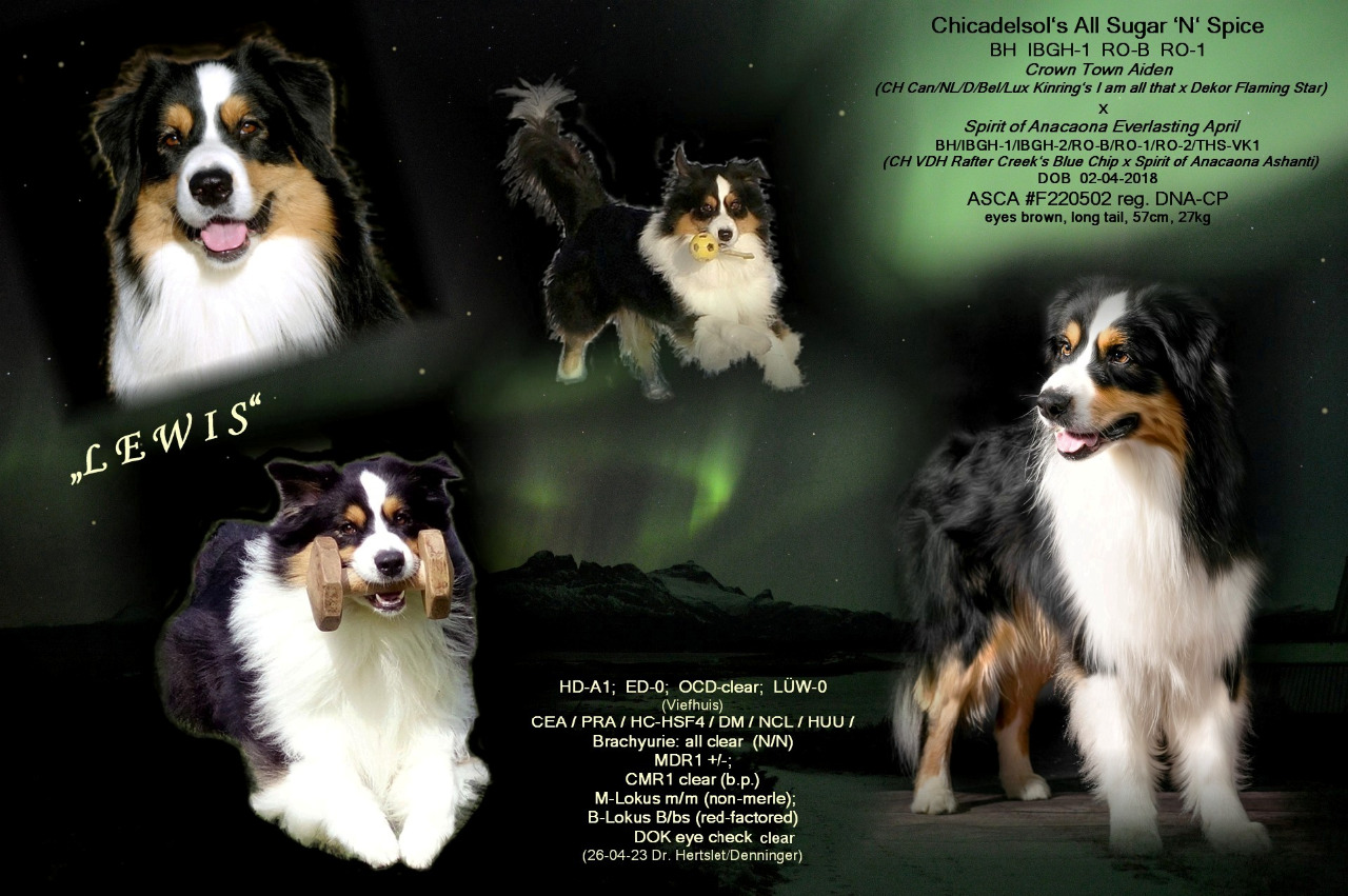 LEWIS ist ein schlanker, großer, black tri Rüde mit ausdrucksstarkem Kopf und wunderschönem Haarkleid; gute Knochenstärke, korrekte Winkelungen, sehr gut bemuskelt, raumgreifendes und fließendes Gangwerk; freundliches und aufmerksames WesenLEWIS ist unser "Strahlemann" und unser "Kasper", der sofort jedermanns Sympathie gewinnt. LEWIS ist feinfühlig und liebevoll, aber auch wachsam wie es für Aussies typisch ist. LEWIS wird sportlich im Rallye Obedience und im Turnierhundesport geführt und hat auch bereits im Gebrauchshundesport einige seiner Fähigkeiten unter Beweis gestellt.